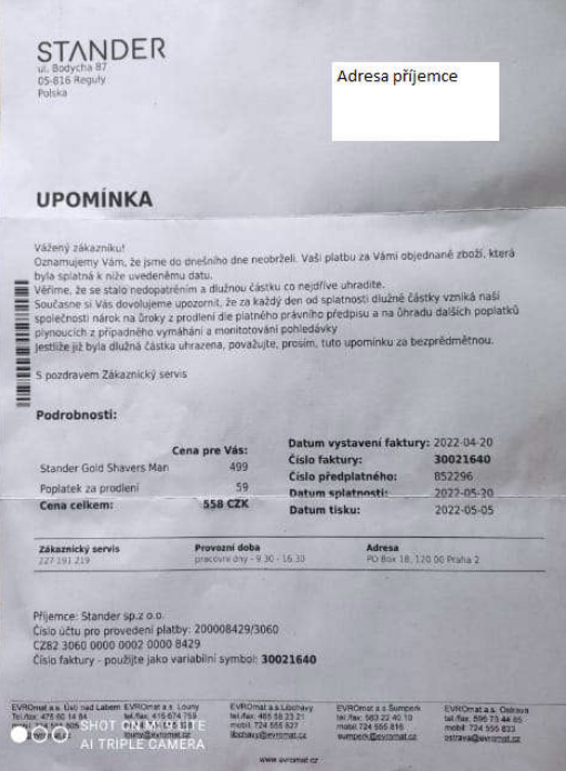 Pro upřesnění doplňujeme, že společnost EVROmat a.s. nevymáhá žádné své pohledávky prostřednictvím třetí osoby ani žádné své pohledávky z obchodního styku nepostupuje na třetí osoby a jediný účet, na který společnost EVROmat a.s. přijímá platby je 2544845510/5500 vedený u Raiffeisenbank a.s.