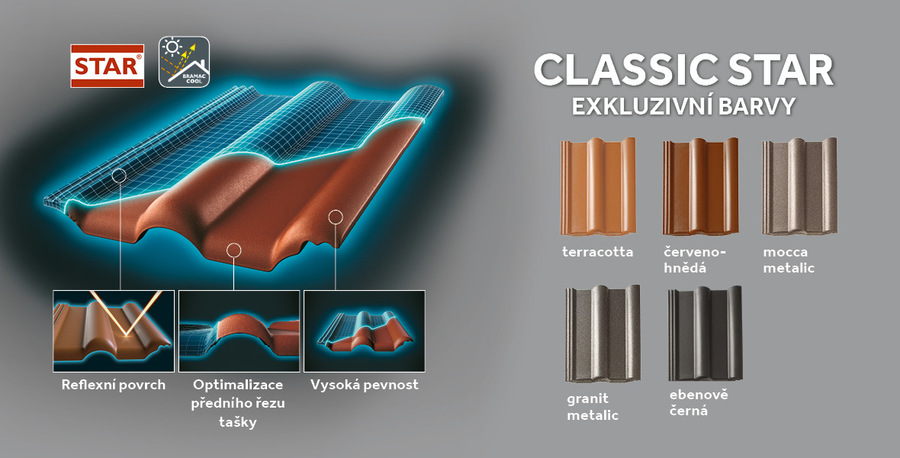 Betonová střešní taška Classic s unikátní technologií STAR je ve výrobě střešních krytin úplnou novinkou a vývojovým skokem vpřed. Bramac STAR přináší zákazníkům zcela novou kvalitu a ochranu.